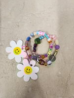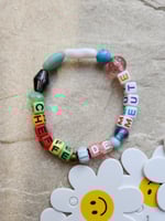 Bracelet en élastique, perles alphabet en acrylique, perles de verres, verre de Murano, acétate et pierres fines.
