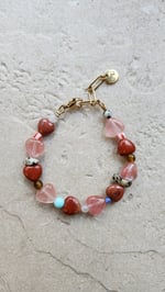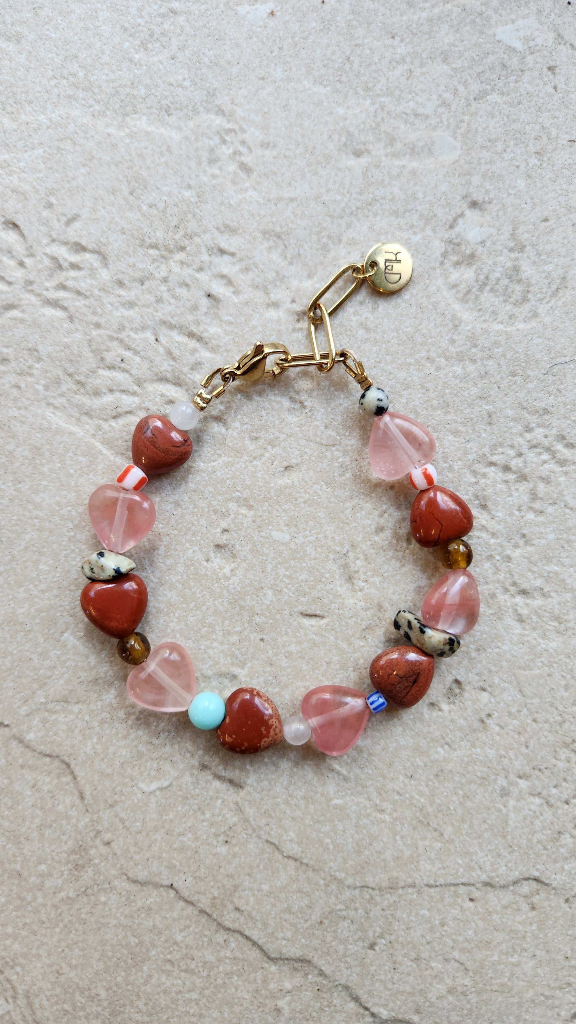 Ce bracelet en pierres naturelles est un doux melange de petits coeurs en jaspe rouge, quartz cherry et amazonite + un mixe de petites perles en verre de Murano, pierre de lune, japse dalmatien, acetate et verre poli pour un style ultra-love.