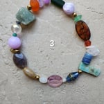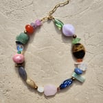 Verre de Murano, verre, améthyste, lapis lazuli, quartz teinté, céramique, aigue marine, quartz rose, cristal de roche et japse brun, agate teintée.